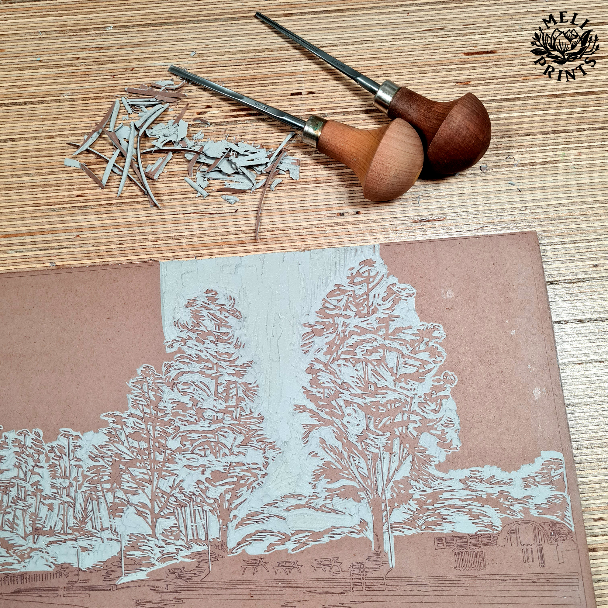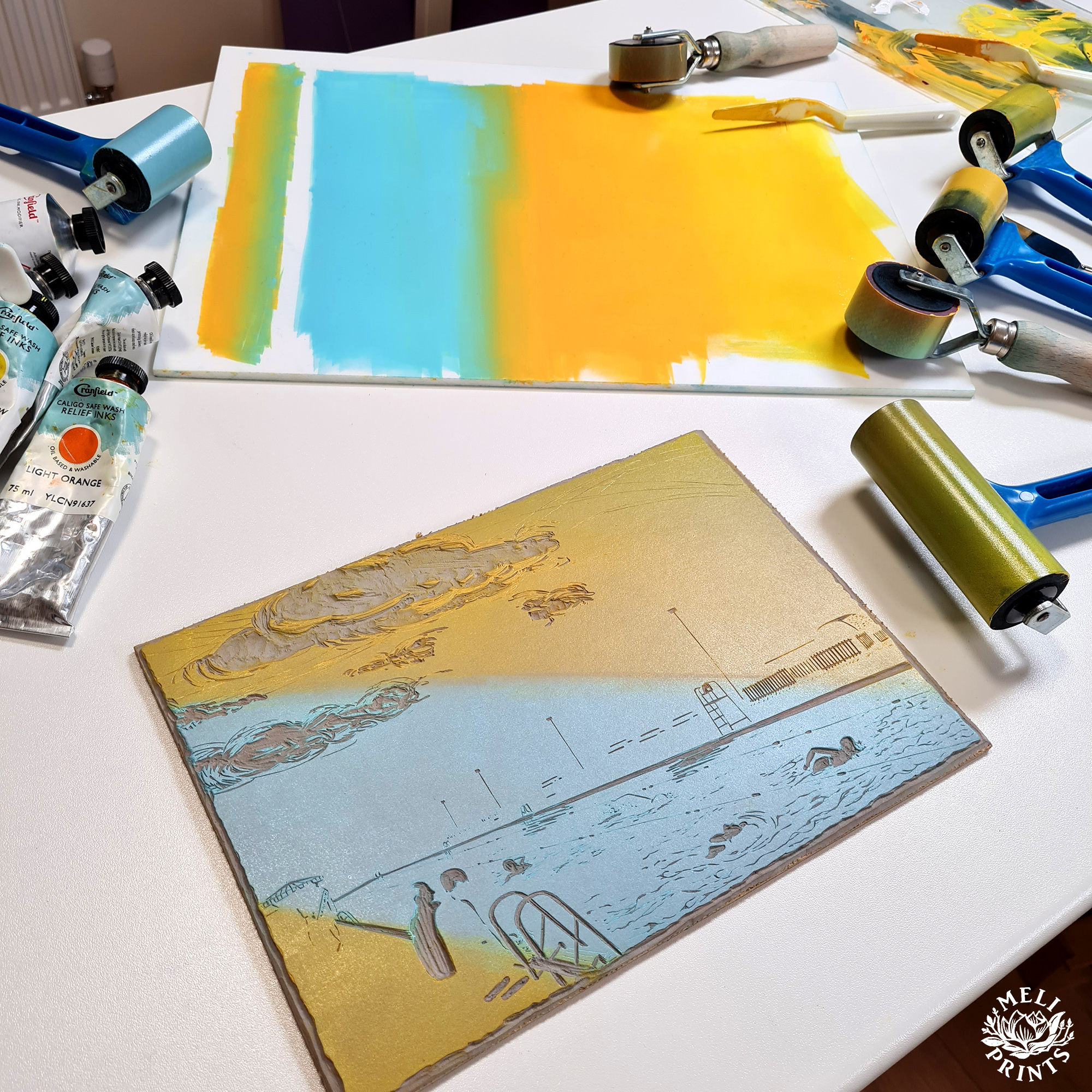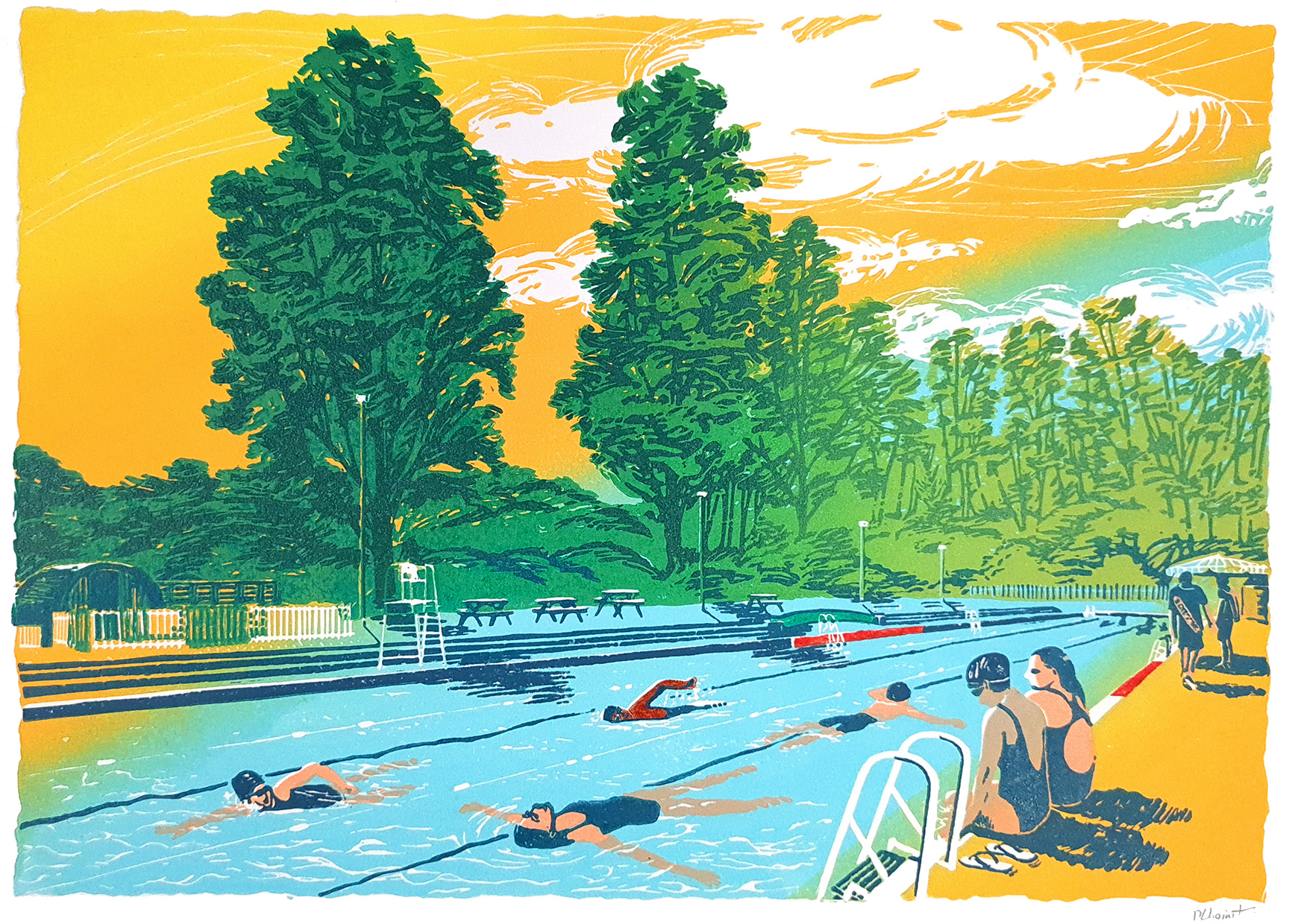 A vibrant linocut print of Cambridge’s Jesus Green Lido capturing a warm summer day, with swimmers gliding through blue waters under a golden sky.