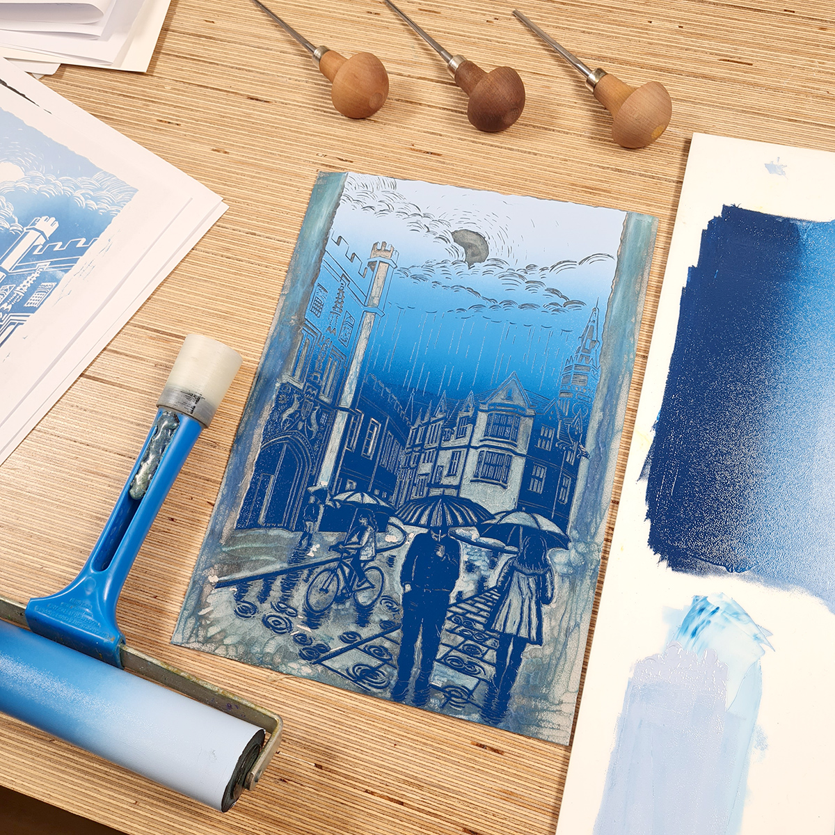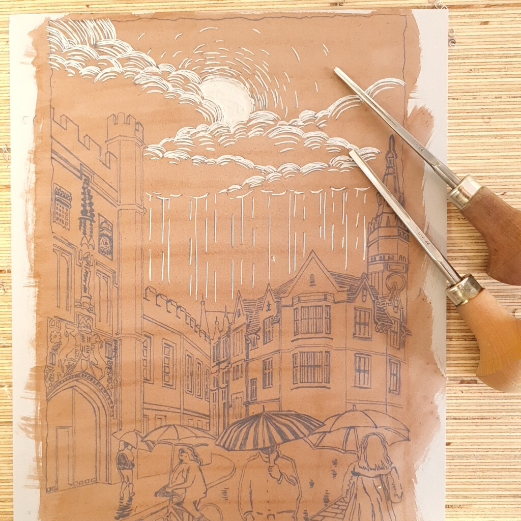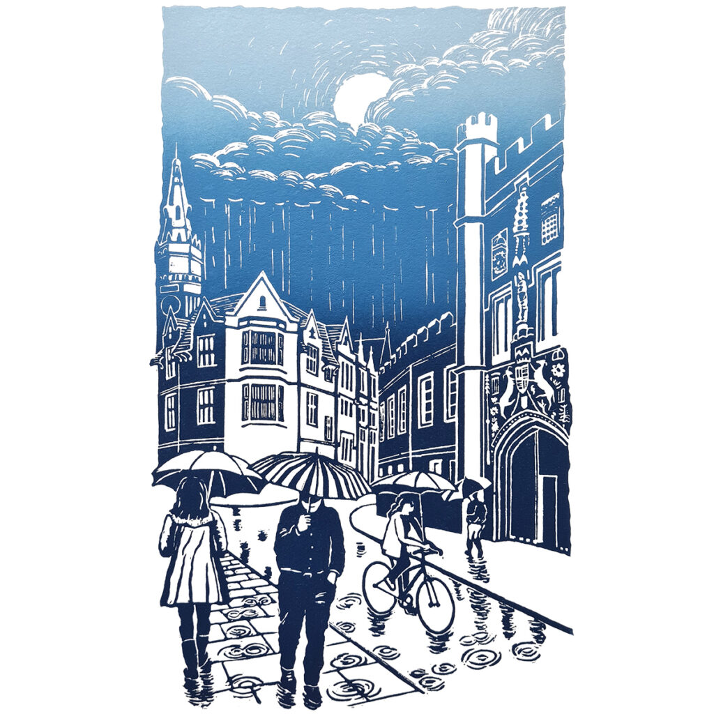 This original linocut print is inspired by a rainy day in Cambridge, walking by Christ’s College Great Gate and enjoying a very welcomed break through the clouds.