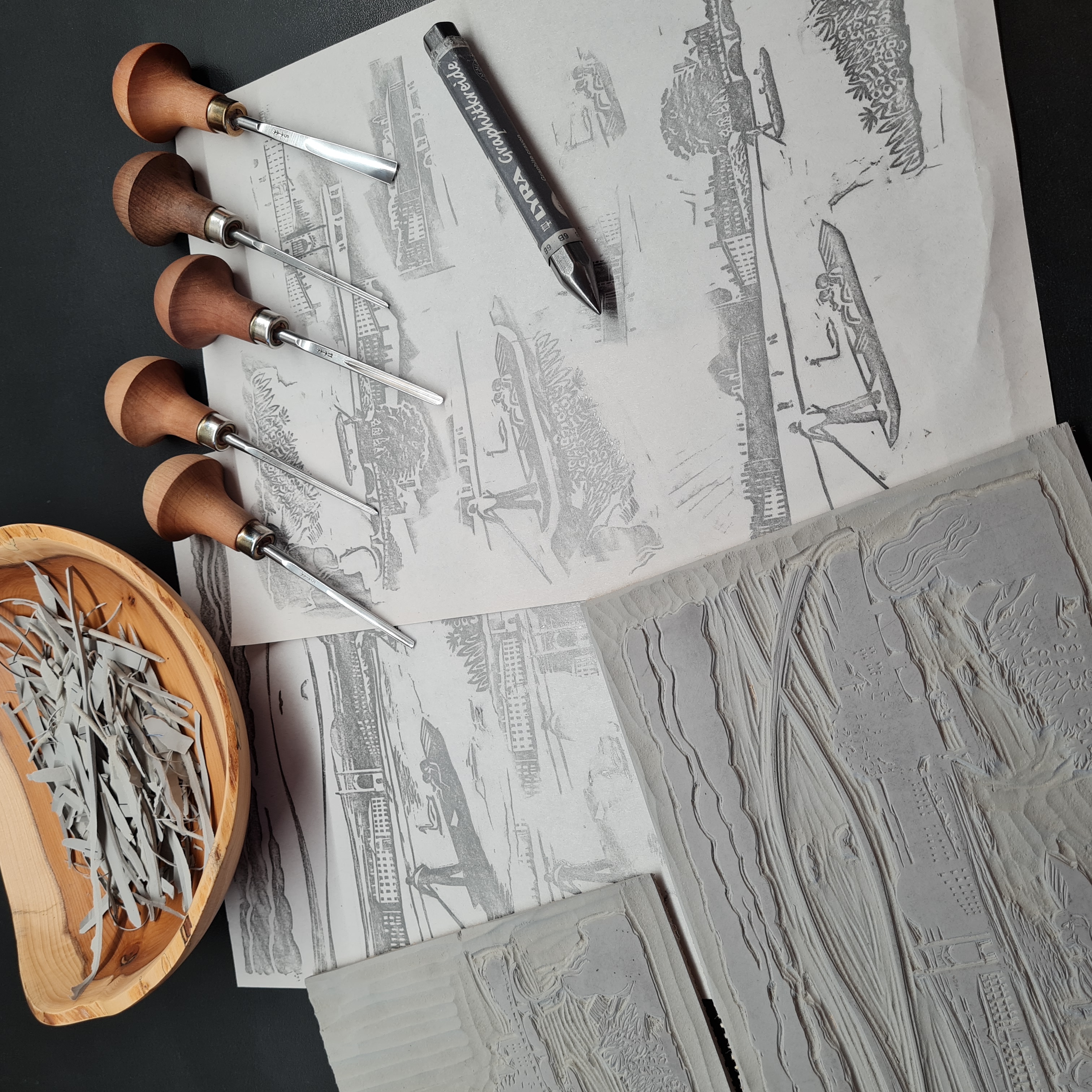 Linocut is a traditional relief printing technique that I love for its tactile, hands-on nature. I work with genuine linoleum made from natural materials such as linseed oil and wood flour. The image is carved into the surface, inked, and pressed onto paper — each print revealing a reversed impression of the block.